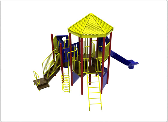 The Taylor playground features an octagonal roof, slide, and multiple climbing options. Its bright colors and open design make it perfect for group play and exploration.